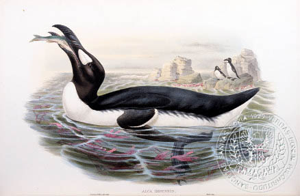 ところが、同じウミガラスの仲間でオオウミガラス(図11-4)というもっと大きな種はかつてカナダからノルウエーにかけての大西洋や北極海に広く分布していたが、ペンギンと同様に飛べない鳥だった。巨大なコロニーを作って繁殖するため、肉と卵は食用に、さらに羽毛や脂肪などのために乱獲され1850年頃に絶滅した。最後の繁殖地はアイスランドのエルディ島だったと言われている。