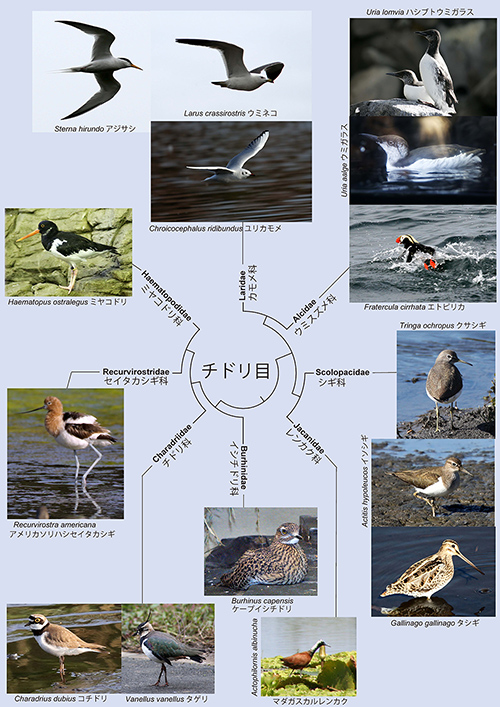 図11-5にウミガラスがチドリ目のなかでカモメと共通の祖先から進化してきた様子を示した。ウミガラスと同じウミスズメ科には、北海道の海でも見られるエトピリカも含まれる。