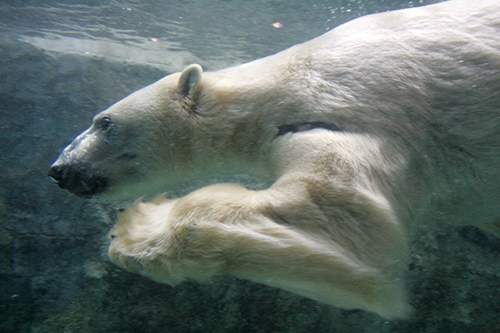 ホッキョクグマはその名前の通り、北極周辺の地域に分布する。彼らは厳しい寒さに適応したからだの構造をもっている。哺乳類の体毛はたいてい光を透過しないが、ホッキョクグマの体毛は光を透過し、内部が空洞の構造のために散乱される光によって白く見える。彼らの体毛は太陽光の通過を妨げないので皮膚にまで届き熱をもたらす。厚い脂肪層と内部が空洞になっている特殊な構造の体毛が、保温の役割を果たしている。図12-1の写真のように、彼らは泳ぎがうまく、氷の海を何時間も泳ぐことができるという。