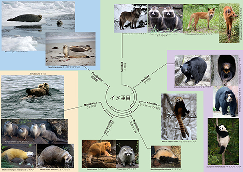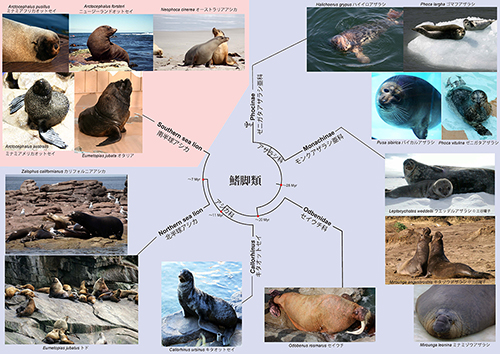 アシカやアザラシは鰭脚類と呼ばれ、食肉目のなかの1つのグループである。食肉目はイヌ亜目とネコ亜目に分けられる。図12-3にイヌ亜目の系統樹マンダラを示したが、鰭脚類はイタチ科、アライグマ科、スカンク科、レッサーパンダ科から成るイタチ上科と共通の祖先から進化した。