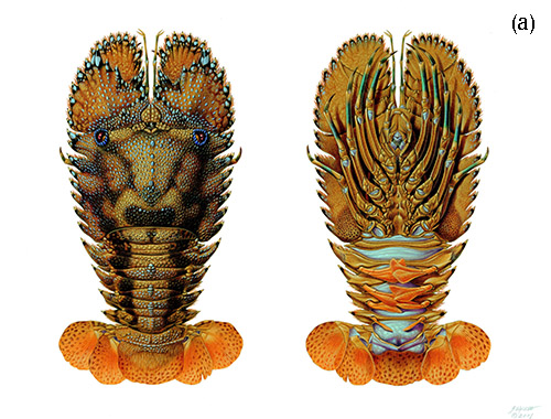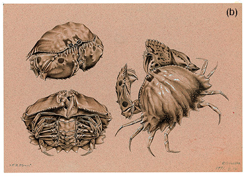 図19-1a、bは若くして亡くなった天才的な博物画家・杉浦千里(1962-2001)の描いたゾウリエビとメガネカラッパ(カニ)の細密画である。からだの裏側から見た図19-1aの右と図19-1bの左下の画では、連続相同の関係にある多様な付属肢が描かれている。触角、顎、歩脚、鰓脚、尾、カニのハサミなどが連続相同の関係にある。
