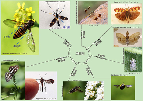 図20-5 昆虫の翅の多様化。昆虫綱のなかで最初にほかから分かれたトンボなどの蜻蛉目では、前翅と後翅はよく似たかたちであるが、そのあとから分かれたグループでは様々に分化している。アブやガガンボなど双翅目昆虫では、後翅が変化して平均棍になっている。コアオハナムグリの写真から分かるように、鞘翅目(甲虫)では、飛翔にはもっぱら膜状の後翅が使われ、硬い鞘状の前翅は飛んでいないときに柔らかい後翅を保護するように機能している。クリックすると大きく表示されます。