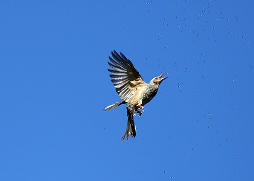 図20-7 空中の一点に留まって(ホバリングしながら)ユスリカを捕食するヒヨドリHypsipetes amaurotis.鳥類のこのようなすぐれた飛翔能力は、歩行用の後足はそのままにして、前足を翼に進化させることで実現できた)。