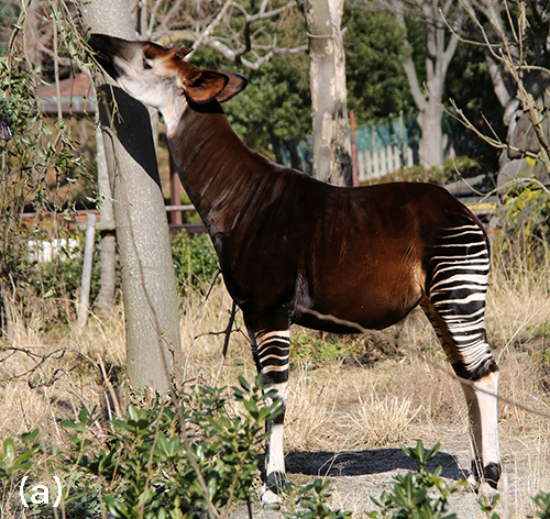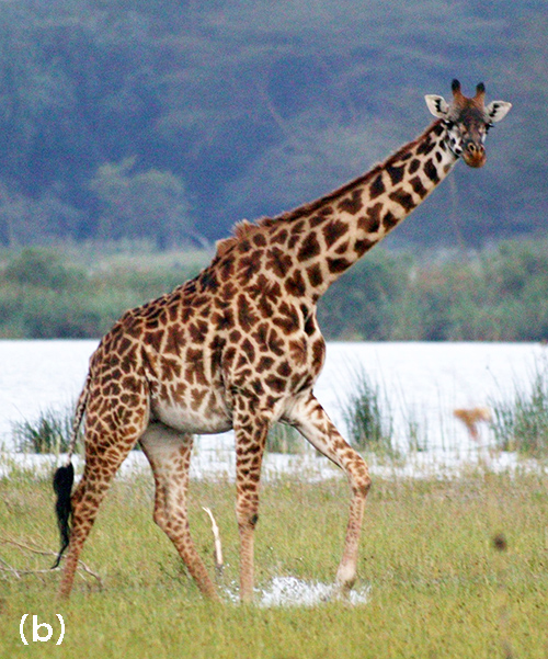 図26-2 (a)オカピOkapia johnstoni、(b)キリンGiraffa camelopardalis。キリンに一番近縁な現存する動物はオカピである。キリンの祖先もオカピのような首の短い動物だったと考えられる。(a)のように、高い枝にある葉を食べようと首を伸ばしているうちに、少しだけ長い首という獲得形質が子孫に継承され、次第に現在のキリンのような長い首になったというのが、ラマルクによって最初に提唱された「獲得形質の遺伝」説である。