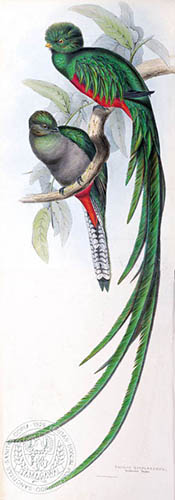 図27-2 カザリキヌバネドリPharomachrus mocino。ケツァールともいう。右がオスで、左がメスである(ジョン・グールド『キヌバネドリ科鳥類図譜』(第1版)より、玉川大学教育博物館提供画像)