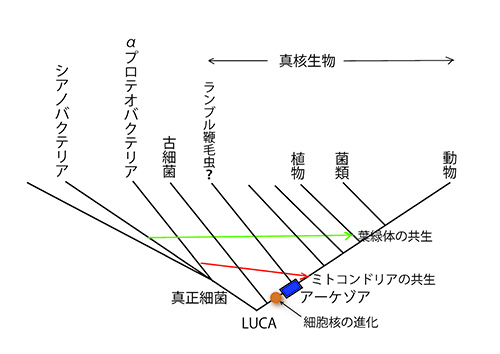 こうなると、アーケゾアというミトコンドリアが共生する前の祖先型真核生物が存在したという考えに疑念が生ずる。アーケゾアというミトコンドリアの共生を経験したことのない真核生物は地球のどこかに人知れずひっそりと生き延びているか、あるいはすでに絶滅してしまったという可能性はある。しかし、もう一つ別の可能性も考えられる。つまり、そもそもそのような生物は存在しなかったという可能性だ。ミトコンドリアの共生が、真核生物の誕生と密接に関わっているかもしれないということである。