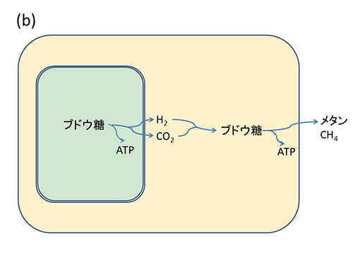 一方、ヒドロゲノソームは、二酸化炭素と水素を放出するので、これがそばにいればメタン生成菌が生きていく上で必要な水素がそこから得られることになる。