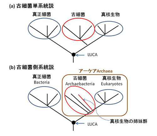 図33-2 古細菌単系統説(a)と古細菌側系統説(b)。