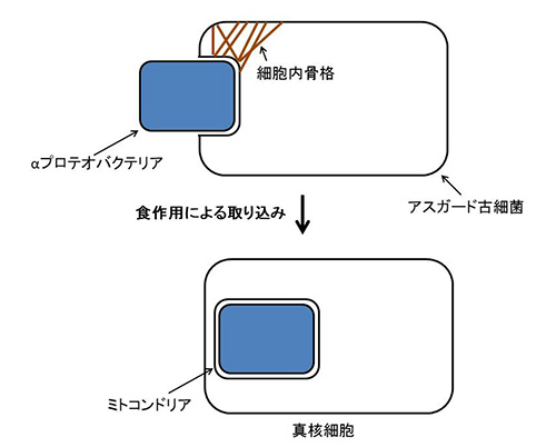 アスガード古細菌群には、真核生物の主要なシグネチャー遺伝子の多くが見いだされるという。ミトコンドリアになるαプロテオバクテリアを内部共生させて取り込むためには、その宿主となる細胞にはほかの細胞を取り込むための機構、つまり食作用を可能とする細胞内骨格などがあらかじめ進化していることが必要であったと思われる。