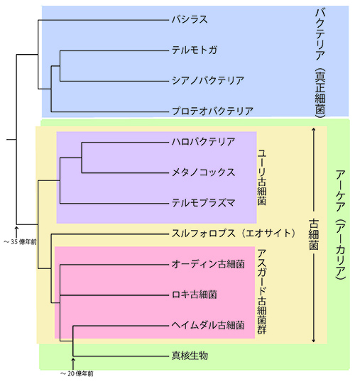 真核生物がアスガード古細菌群から進化したものならば、いわゆる古細菌は系統的にまとまったグループではないことになる。そのために、これまでの「真正細菌」「古細菌」「真核生物」の3つの超生物界への分類に代わって、古細菌と真核生物をあわせた「アーケアArchaea」という超生物界を設け、これと「真正細菌Bacteria超生物界」の2つの分類単位に地球上のあらゆる生物を分類するべきかもしれない(図34-1)。
