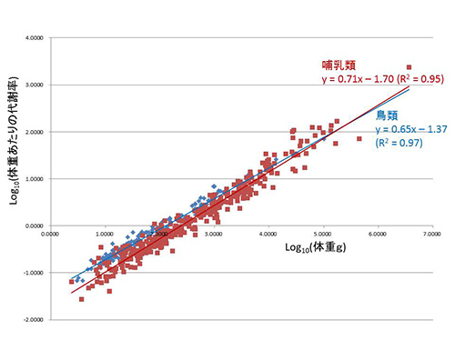 生活スタイルの似た動物だけを集めて解析すればもっときれいな相関関係が得られるが、この大雑把な解析でも相関関係は明らかである。小さな動物は、大きな動物にくらべて短命な傾向が明らかだ。さらにこの図から同じ体重であれば、鳥類にくらべて哺乳類のほうが短命であることがわかる。