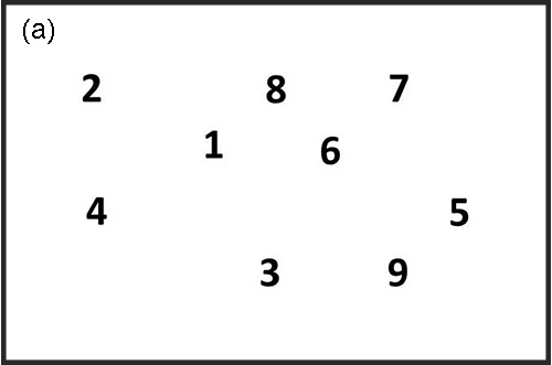 京都大学霊長類研究所の井上紗奈さんと松沢哲郎さんは2007年に、チンパンジーの記憶能力でヒトよりも優れている面があることを見出した。それは図50-2aのようにタッチスクリーン上のランダムな位置に現れる1から9までの数字を小さい順にタッチしていくテストだが、1にタッチした途端にほかの数字は図50-2bのように隠されてしまうという設定である。従ってチンパンジーはすべての数字の配置をおぼえなければならないが、図50-2aのような画面を0.21秒間見ただけで、おぼえてしまうという。