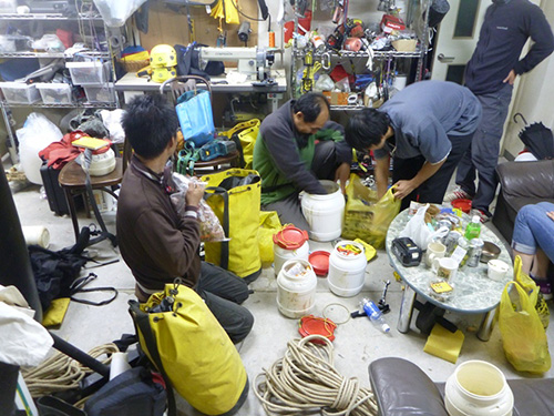 探検のための装備も含めて、すべての荷物をパッキングするのにメンバー全員で丸1〜2日かかる。探検の成功を決めるのは探検直前のパッキングだと言っても過言ではない。なぜなら、どのバッグに何が入っているか全員で把握しておきたいからだ。そうしないと、厳しい環境の洞窟の中で、例えばよく使う道具の「カラビナをとってくれる?」「え? どこですか?」と返答するようでは、洞内の貴重な時間がもったいないし、ストレスが溜まる。もっと言うと「カラビナ」という言葉さえ省略するために、カラビナを入れたバッグに緑色のテープを貼って色で誰でもわかるようにしておけば、洞内では「緑」と言うだけで、カラビナがほしいのだと相手に伝わるのだ。