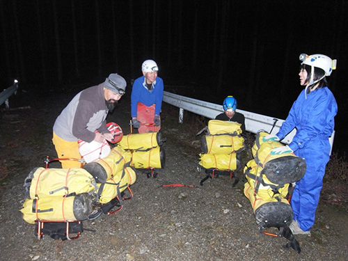 一方、洞窟は山と違って、洞内に入ると外からの情報が一切遮断され、光がまったく届かない真っ暗の空間なのだ。一度入ったら昼か夜かもわからなくなる。狭い場所が多く固い岩に囲まれているため閉塞感が常にあり、立ち上がって歩ける場所も少なく、湿度が高くじめじめしていている。地面は大きな岩がごろごろしているガレ場か、洞内を流れる水が運んだ泥でぬかるんでいるか、あるいは水中か。いずれにしてもそこにいるだけで相当にストレスがかかる。なので、心をリセットするために食事ぐらいはおいしく、たのしく、みんなでおしゃべりしながら食べたいのだ。それがひいては、洞窟探検のさらなる充実につながることは、20年以上続けている洞窟探検のリーダーとして実感している。