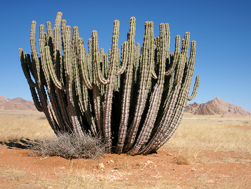 一方、乾燥に適応したものも多い。図5P2にあるように、トウダイグサ科のユーフォルビアのなかには次回詳しく紹介するアメリカ大陸固有のサボテンとそっくりなものがある(図のユーフォルビアはアフリカ・ナミブ砂漠のもの)。