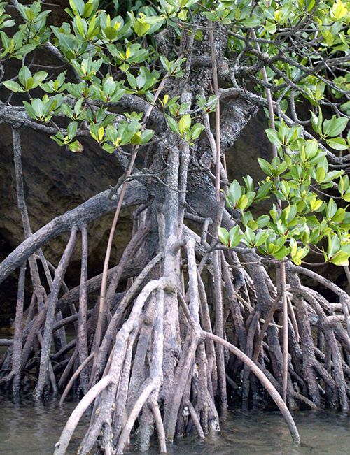 沖縄などでよく見られるガジュマルやアコウなどもそのための変わった戦略を採る。鳥やコウモリが食べたイチジクの果実の種子が糞として木の枝の上などに落ちると、そこで発芽して根を伸ばす。根とはいっても、地面から生えているものではなく、最初は気根といって空中に垂れ下がったものである。気根は枝分かれして太くなり、樹木に巻きつきながら伸びて地面に到達すると、その後は地面からの水分や養分を吸い上げて、どんどん太くなる。