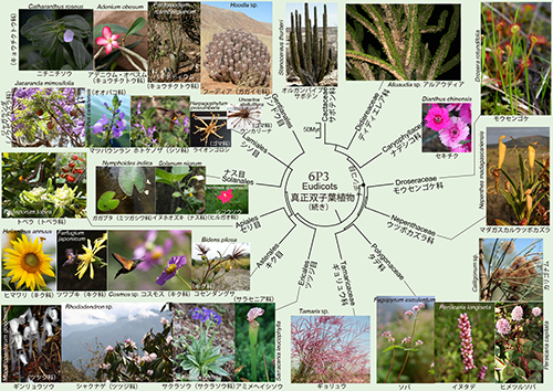 ナデシコ目だけ目内の系統関係を詳しく示したが、そのなかで近縁な関係にあるサボテン科とディディエレア科には乾燥地に適応したものが多い。同じ目のギョリュウ(ギョリュウ科)も乾燥地に適応している。