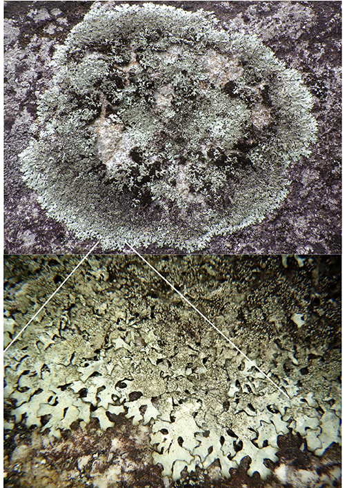 地衣類では、共生者の藻類が光合成によって糖類などの有機物を合成しその一部を宿主の菌類に与える。菌類は岩や土に菌糸(きんし)を伸ばして、水や無機養分を吸収し、藻類に与える。このような共生で成り立っているのが地衣類である。
