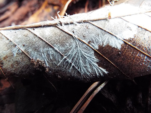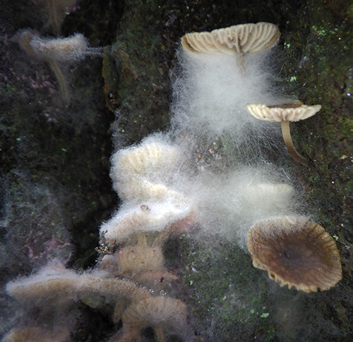 担子菌の多くがわれわれの目にとまるのは、図7Fで写真として示されたようなキノコとしてである。しかし、キノコは次世代に命をつなぐ胞子を生み出すための子実体という繁殖のための構造であり、菌類の本体は下の写真で示された菌糸である。菌糸は枯れた葉の表面、枯れた木材の中、さらに森の地中に広がっている。