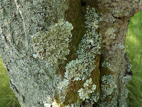 また、藻類が菌類に共生してできる地衣類(ちいるい、図7Fと下の写真のウメノキゴケや第1話・図1のコアカミゴケやサルオガセ)は、たいてい子嚢菌を宿主(しゅくしゅ)とするものである。