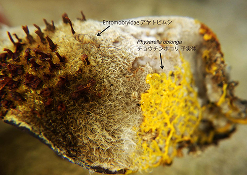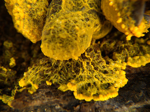 ここで示したアオモジホコリの変形体は数十cmの広がりをもつが、これ全体が一つの細胞なのだ。次第に大きな変形体になると、キノコなども食べて成長する(その次の写真)。