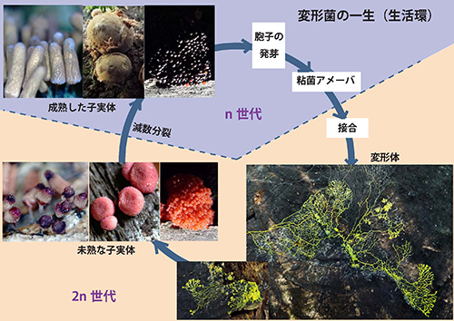 アメーバにはオス・メスがあり、異性が出会うと接合して染色体数2nの変形体になる。変形体の細胞核は分裂して増えるが、細胞はたくさんの核をもったまま分裂せずに大きくなる。