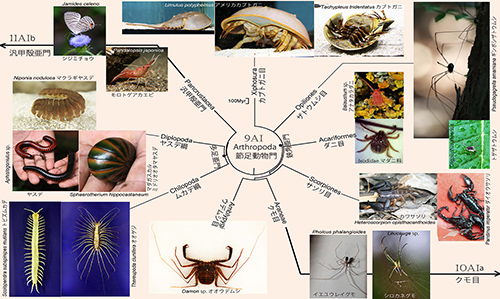 鋏角亜門にはカブトガニ、ザトウムシ、ダニ、クモなどが属する。図9AIに示した時間スケールは100Myr(「Myr」は100万年前を表す時間の単位)、つまり1億年だから、同じ鋏角亜門に属するカブトガニ、ザトウムシ、ダニ、クモなどは5億年以上前のカンブリア紀前期にはすでに別々の系統に分かれていた。このように節足動物進化の歴史は非常に長いのである。