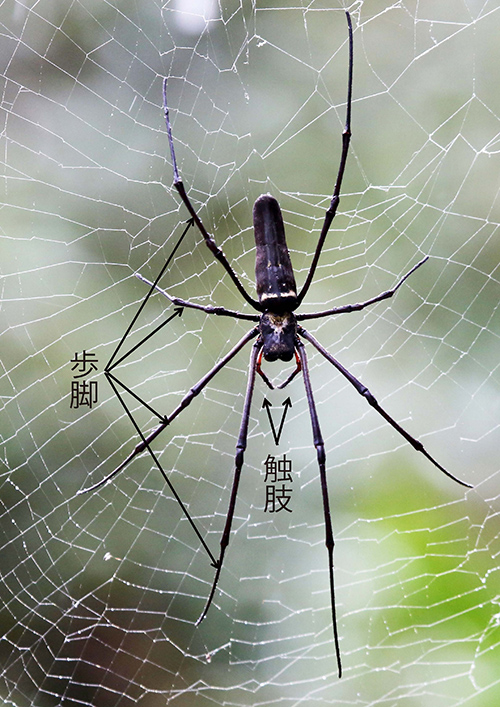 下に鋏角亜門の代表としてオオジョロウグモの写真を示す。鋏角類は4対の歩くための脚(歩脚)のほかに、1対の触肢をもつ。触肢は鋏角亜門のさまざまな系統でさまざまに改良されている。サソリでは獲物を捕らえるためのハサミになり、ダニでは糸を作り出すための器官として(クモの糸を作る器官は別)、オスのクモではメスのからだに精子を送り込むための器官として、という具合である。また、オスのクモでは触肢を求愛の道具として使うものもいる(5)。