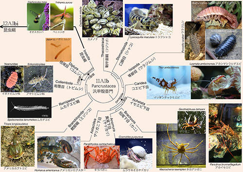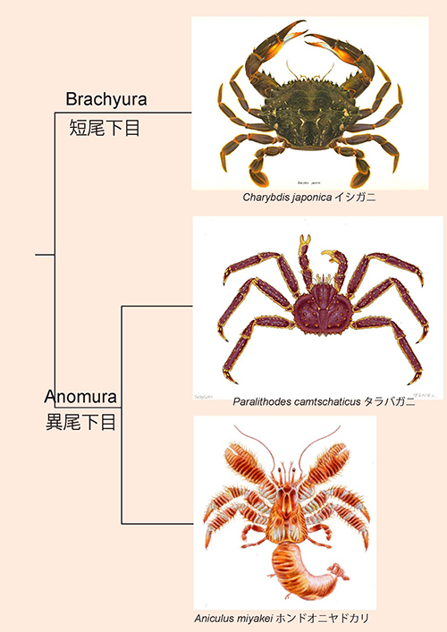 エビやカニの仲間は、脚を5対、計10本もつので、「十脚目」という。この目は、いわゆるエビと呼ばれるグループのなかで一番多様なコエビ下目、大型海生エビのイセエビ下目、カニなどの短尾下目、ヤドカリなどの異尾下目、ザリガニ下目などから成る。これらのなかで、コエビ下目が最初にほかから分かれ、ザリガニ下目が続いて分かれた。残りのグループのなかでは、短尾下目(カニ)と異尾下目(ヤドカリ)が姉妹群の関係になる。