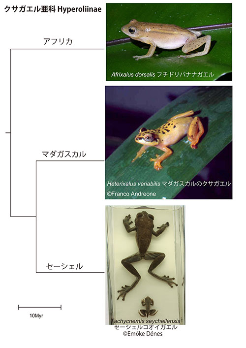 ところが、下の系統樹によるとクサガエル亜科内のこれらの分岐は過去およそ2000万年の間のものであり、ゴンドワナ超大陸の分裂と関連づけるには新し過ぎる。マダガスカルやセーシェルのカエルはどのようにして現在の生息地に到達したのだろうか?
