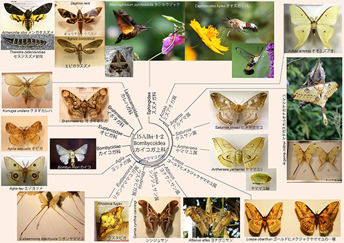 カイコガ上科にはカイコガ科、ヤママユガ科、スズメガ科、オビガ科、イボタガ科、カレハガ科などが含まれる。そのなかで、カイコガ科のカイコ(Bombyx mori)は絹の生産のために家畜化された昆虫であり、「家蚕(かさん)」と呼ばれ、人類の歴史に深く関わってきた。
