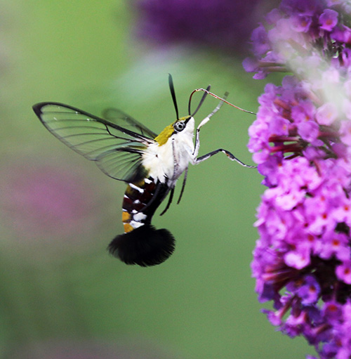 ガやチョウが属する鱗翅目(りんしもく)という分類名は、成虫の翅が鱗粉(りんぷん)で覆われていることからきているが、下の写真のようにオオスカシバの成虫には鱗粉がない。羽化した直後には鱗粉がついているが、次第にそれが落ちて、透明の翅になるのだ(6)。