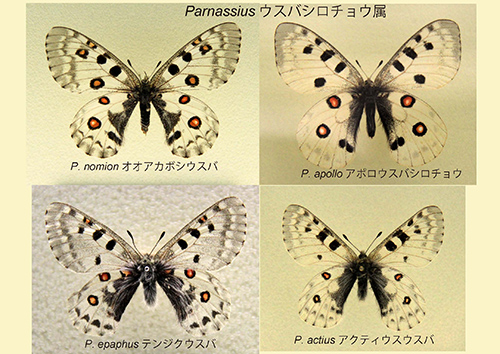 日本にはウスバシロチョウ属(Parnassius)が3種分布している。北海道の大雪山系や十勝連峰の高山地帯(標高およそ1500m以上)にしかいないウスバキチョウ(キイロウスバアゲハともいう;P. eversmanni)と北海道から本州、四国に分布するウスバシロチョウ(ウスバアゲハともいう;P. citrinarius)、それと北海道にしか分布しないヒメウスバシロチョウ(ヒメウスバアゲハともいう;P. stubbendorfii)である。北海道ではヒメウスバシロチョウのほうがウスバシロチョウよりも広い地域に分布する(8)。