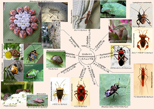 このようにカメムシ下目の多くは植物の汁液を吸うため、農業作物の害虫として嫌われるものが多いが、図30AIbi-5-1でカメムシ科の一番下にあるチャイロクチブトカメムシなどのクチブトカメムシの仲間は、太い口吻をチョウやガの幼虫や甲虫などのからだに差し込んで体液を吸うため、農業害虫の天敵として役立っている(1)。