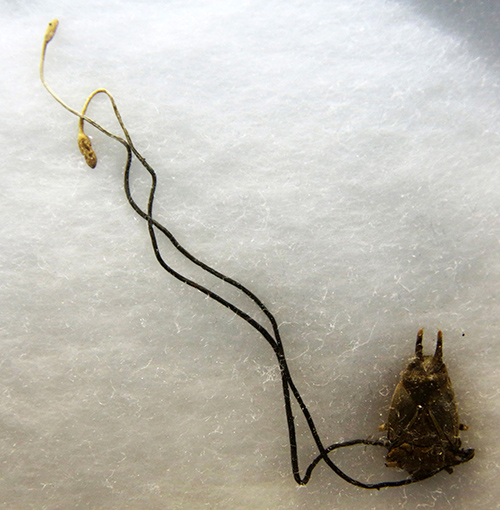 下の写真は、ツノカメムシ科のカメムシから生えている冬虫夏草である。この菌類は生きた昆虫にとりついて、そのからだから栄養分を吸収して成長する。