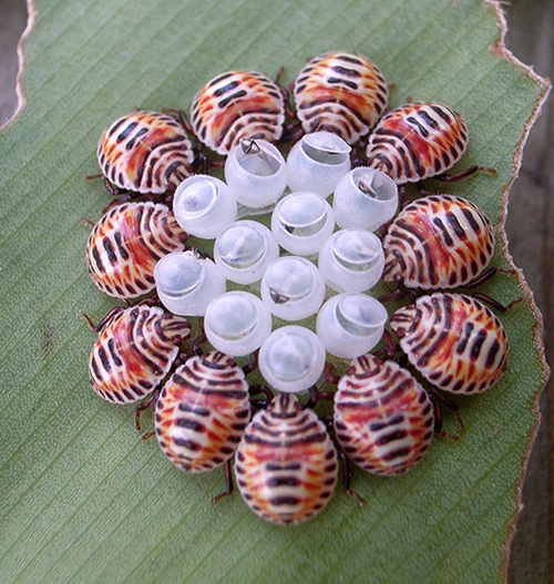 下の写真で示したマルカメムシ科のカメムシも、腸内に共生細菌をもっていて、抗生物質でそれを除去すると半分以上が幼虫の段階で死んでしまう。なんとか生き残って成虫になっても、繁殖できない。