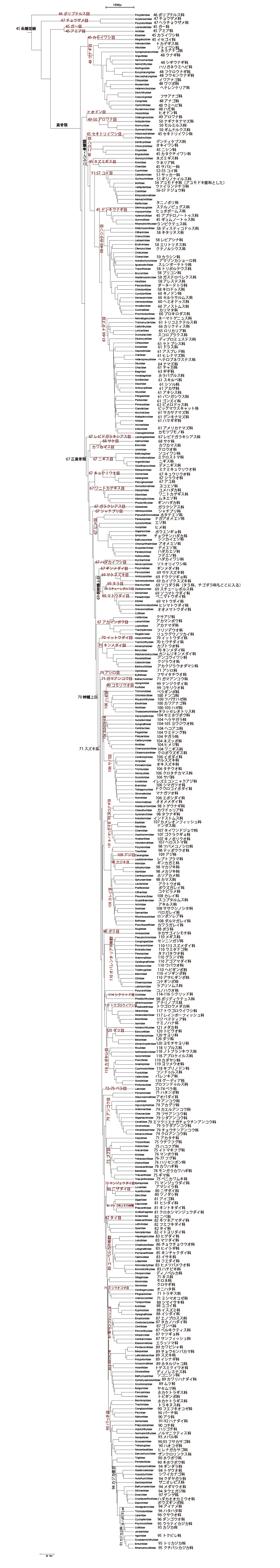 一応以前の大きな系統を扱っているところに立ち戻って、系統樹全体における位置を捉えられるようにはなっているが、ここで補足のために条鰭亜綱全体の科のレベルの系統樹を示しておこう。