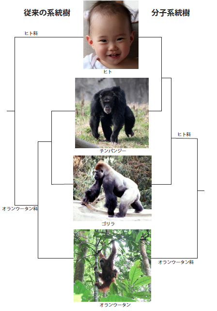 30年前くらいまでの動物園では、チンパンジーやゴリラのおりの前にはオランウータン科という看板が立っていたものです。これらはみんな同じグループであって、ヒトの親戚であるとしても、とても遠い親戚だと考えられていました。当然ヒトだけがこれらの類人猿とは別の独自の科であるヒト科に入ると考えられたのです(下図、図1-1左側の系統樹)。