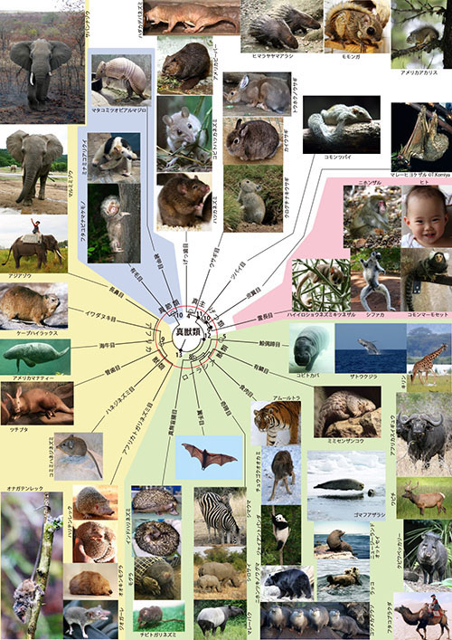 真獣類はカンガルー、オポッサムなどの有袋類やカモノハシ、ハリモグラなど単孔類などのほかの哺乳類と同じ祖先から進化したものです。哺乳類は、鳥類やワニ、カメ、トカゲ、ヘビなど爬虫類と同じ祖先から進化したものです。