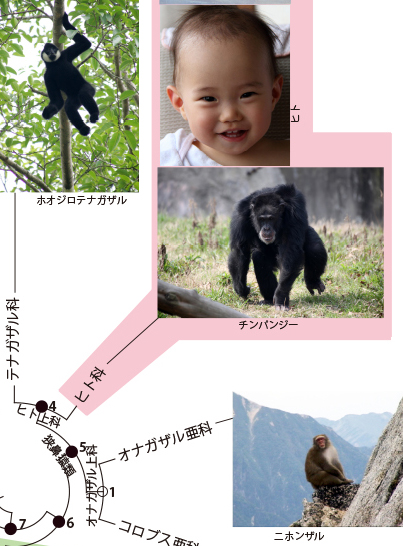 ヒト上科の一番近い親戚が、ニホンザル、ヒヒ、テングザルなどのオナガザル上科です。系統樹のなかで一番近い親戚のことを「姉妹群」と呼びますが、ヒト上科とオナガザル上科は互いに姉妹群の関係にあるということです。