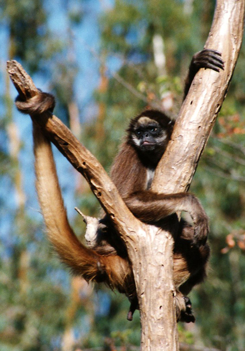 クモザルの尾には指紋のような「尾紋」があり、モノをつかんだ際にすべらないようになっています。さらに、クモザルは4本の足だけでなく、尾も手のように使うことができるのです。