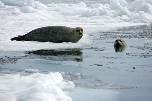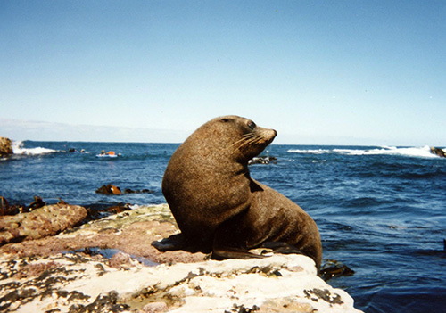 鰭脚類という名前は肢がひれ状になっていることからきています。クジラでも前肢がひれ状になっていますが、後肢は退化してしまっています。それに対して、鰭脚類では4本の肢がすべてひれ状で残っています。また、クジラは出産や子育てを含めて一生を水中で過ごすのに対して、鰭脚類、カワウソ、ラッコなどは少なくとも出産は陸上で行います。なにしろクジラ進化の歴史は5,300万年もあるのに対して、鰭脚類の一番古い化石は2,700~2,500万年前にいたエナリアークトスであって、鰭脚類の水中適応の歴史はクジラの半分程度しかないのです。