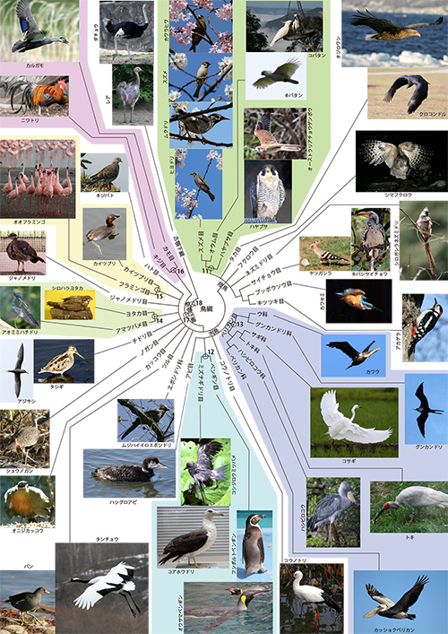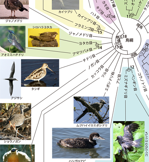 近年、分子系統学の成果をもとに、水鳥グループのなかで大規模な分類の見直しが行われました。それは、コウノトリ目とペリカン目についてです。従来コウノトリ目には、コウノトリ科以外にサギ科、トキ科、ハシビロコウ科などが含まれていましたが、コウノトリ科以外はすべてペリカンに近いことが分かり、ペリカン目に移されたのです。○13の子孫はすべてペリカン目に分類されます。水鳥グループにはこのほかにアビ目があります。