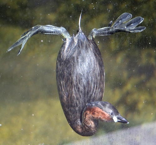 カイツブリの足は、下の写真(図13-6)から分かるように体の極端にうしろから生えていて、まっすぐに立つことができず、地上を歩くことはほとんどありません。しかしこのような位置に足があることによって、水中では大きな推進力を得ることができます。カイツブリは潜水して水生動物を捕らえます。カイツブリはアビに近いとされてきましたが、分子系統学から、フラミンゴ目に近いことが明らかになってきました。