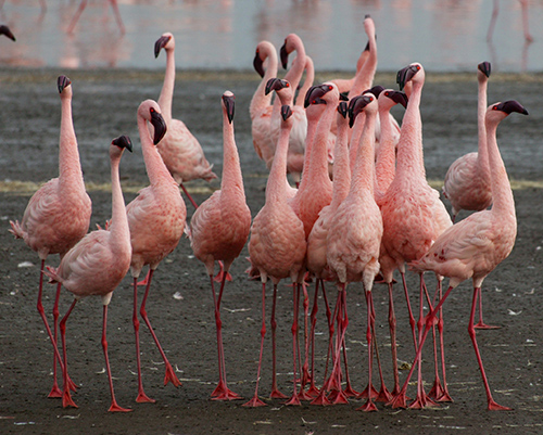 フラミンゴは、その体型から、コウノトリに近いと考えられてきました。フラミンゴはシアノバクテリアや水中プランクトンなどをクチバシの縁のヒゲ状の組織で漉しとって食べています。オオフラミンゴの鮮やかな紅色は、シアノバクテリアの色素であるβ-カロテンやカンタキサンチンによるものです。下の写真(図13-7a)で手前の若鳥は白色ですが、これらの色素を含むシアノバクテリアやプランクトンを食べることで紅色になるのです。
