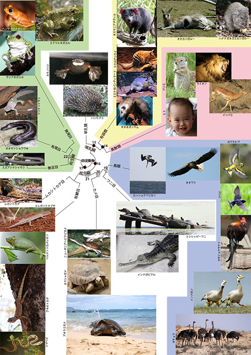 ここで久しぶりに再び僕たちヒトの祖先をたどる旅に戻りましょう。哺乳類の共通祖先●15(図11-1)をさかのぼると、鳥類を含む爬虫類の共通祖先○21の祖先でもある●16に出会います。●16から進化したものはすべて「羊膜類」と呼ばれます。鳥類を含む爬虫類と哺乳類が羊膜類です。爬虫類や単孔類の卵は、胚が羊膜という膜でおおわれ、そのなかに満たされた羊水のおかげで、胚が乾いてしまわないようになっています。胎生哺乳類の真獣類や有袋類でも、胎児を包んでいる構造は同じようなものです。このような羊膜のおかげで、羊膜類の動物は、カエルなどの両生類のように卵を水中に産まなければならないという制約から解放され、一生を陸上で過ごすことができるようになったのです。