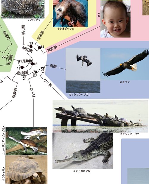 前回は、鳥類の祖先をたどり、ジュラ紀から白亜紀にかけて全盛を誇った恐竜についてお話ししました。さらにその祖先をたどると何に出会うでしょうか? 現在生きている動物のなかで鳥類に一番近いのは爬虫類のワニ類ですから、次に出会うのはワニとの共通祖先○19です(下図をクリックして確認してください)。