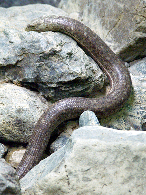 四足動物系統樹マンダラ(図11-1)にあるアシナシイモリは足がなくてまるでミミズのような外見ですが、背骨をもったれっきとした脊椎動物です。足が退化するという現象は、四足動物のさまざまな系統で独立に起りました。両生類のなかでもアシナシイモリ以外に有尾目のサイレンというグループ(図14-4)、爬虫類のなかでヘビ以外にも足のないトカゲが何回も進化しています(図14-5)。これも一種の収斂です。