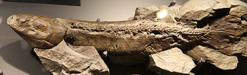 図15-3(下図)がユーステノプテロンというおよそ3億8500万年前のデボン紀に生きていた肉鰭類の化石です。4本の足に相当する鰭には筋肉で囲まれた骨があり、四足動物の祖先に近いと考えられています。共通祖先●18や●19(図15-1)はこのような動物だったのでしょう。