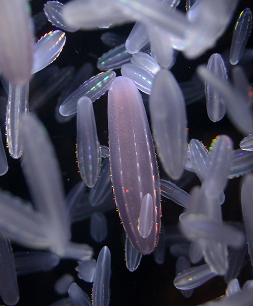 この仲間は「クシクラゲ」ともいいます。刺胞動物のクラゲが筋肉で傘を収縮させることによって泳ぐのに対して、クシクラゲは櫛のように並んだ繊毛の列を波打たせて、推進力を得ています。クシクラゲは刺胞動物のクラゲと似ているため、かつては刺胞動物と有櫛動物をあわせて腔腸動物門に分類されたこともありました。